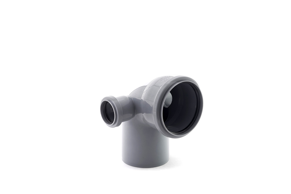 Отвод канализационный диаметром 110 мм под углом 87 градусов для монтажа систем внутренней канализации. Имеет выход слева для трубы диаметром 50 мм