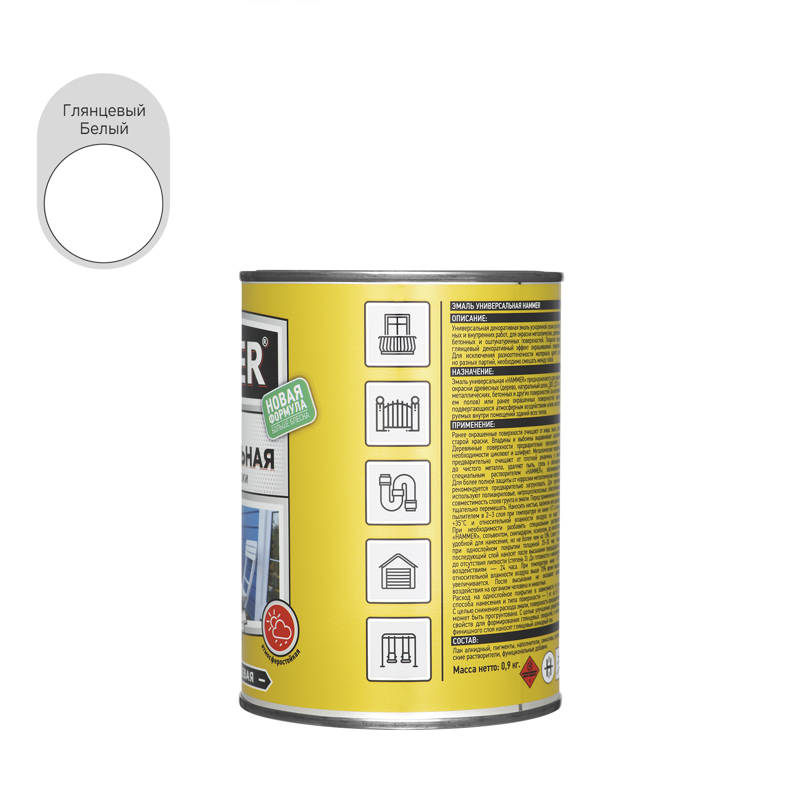 Универсальная эмаль: белая, глянцевая, атмосферостойкая. Для защиты и окраски древесных (дерево, натуральный шпон, ДВП, ДСП и т.п.), металлических, бетонных поверхностей. Расход 12 м²/кг.