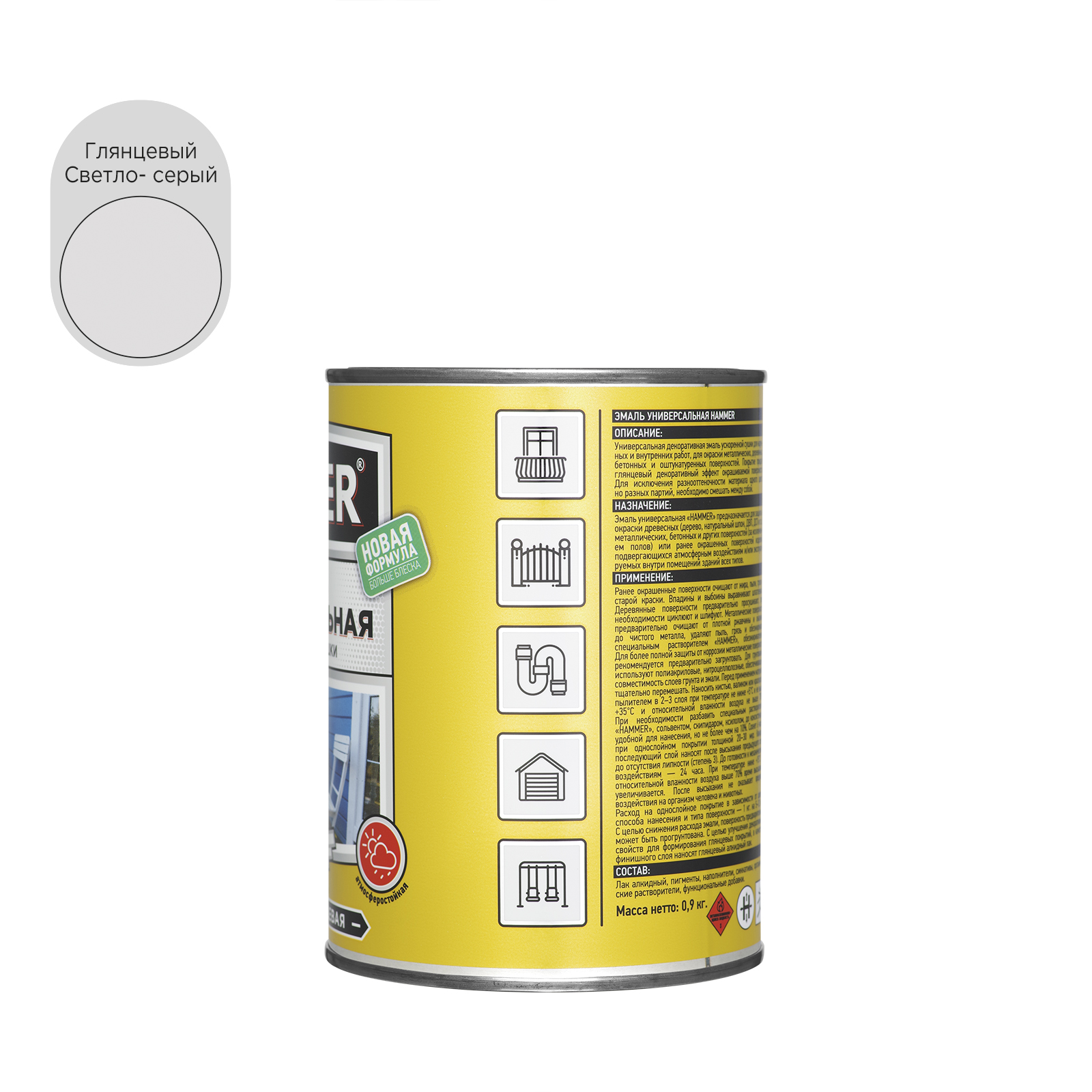Универсальная эмаль: св,-серая, глянцевая, атмосферостойкая. Для защиты и окраски древесных (дерево, натуральный шпон, ДВП, ДСП и т.п.), металлических, бетонных поверхностей. Расход 12 м²/кг.