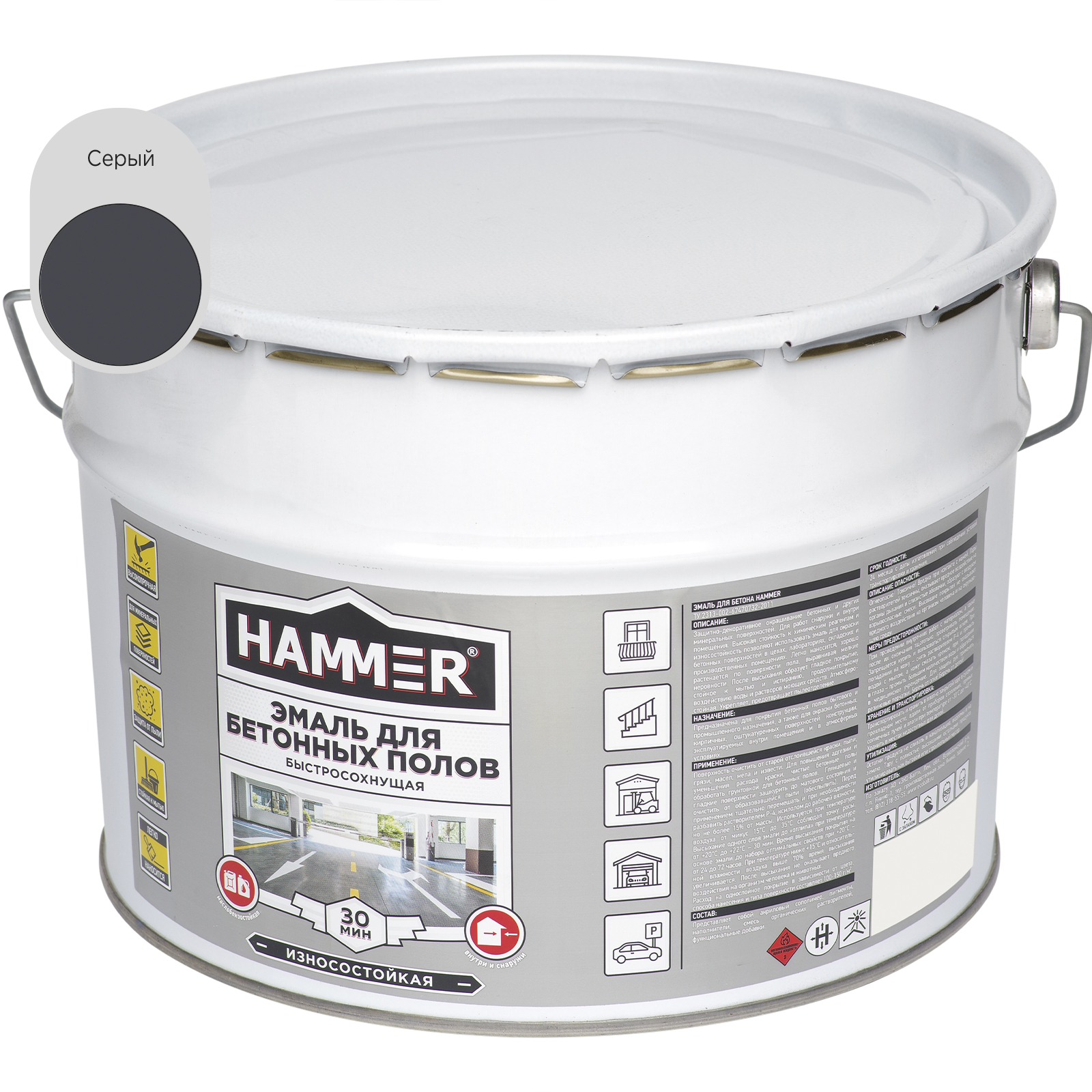 Эмаль HAMMER для бетонных полов: износостойкая, быстросохнущая, маслобензостойкая, для наружных и внутренних работ. Устойчива к химии, влаге, истиранию и пыли.
