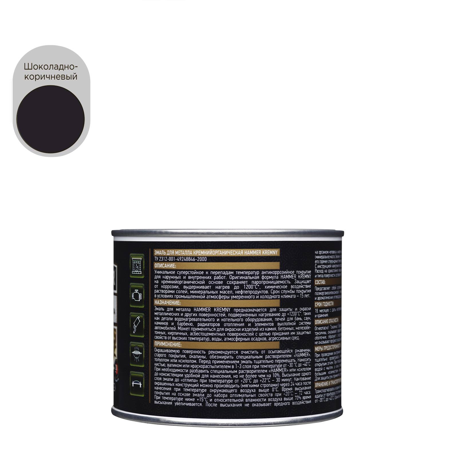 Эмаль для металла HAMMER KREMNY предназначается для защиты и окраски металлических и других поверхностей, подверженных нагреванию до +1200С°, таких, как детали водонагревательного и котельного оборудования, печей для бань, саун, каминов и барбекю, радиаторов отопления и элементов выхлопной системы автомобилей. Может применяться для окраски изделий из камня, бетонных, железобетонных, кирпичных, асбестоцементных поверхностей с целью придания им защитных свойств от высоких температур, воды, атмосферных осадков, агрессивных сред.