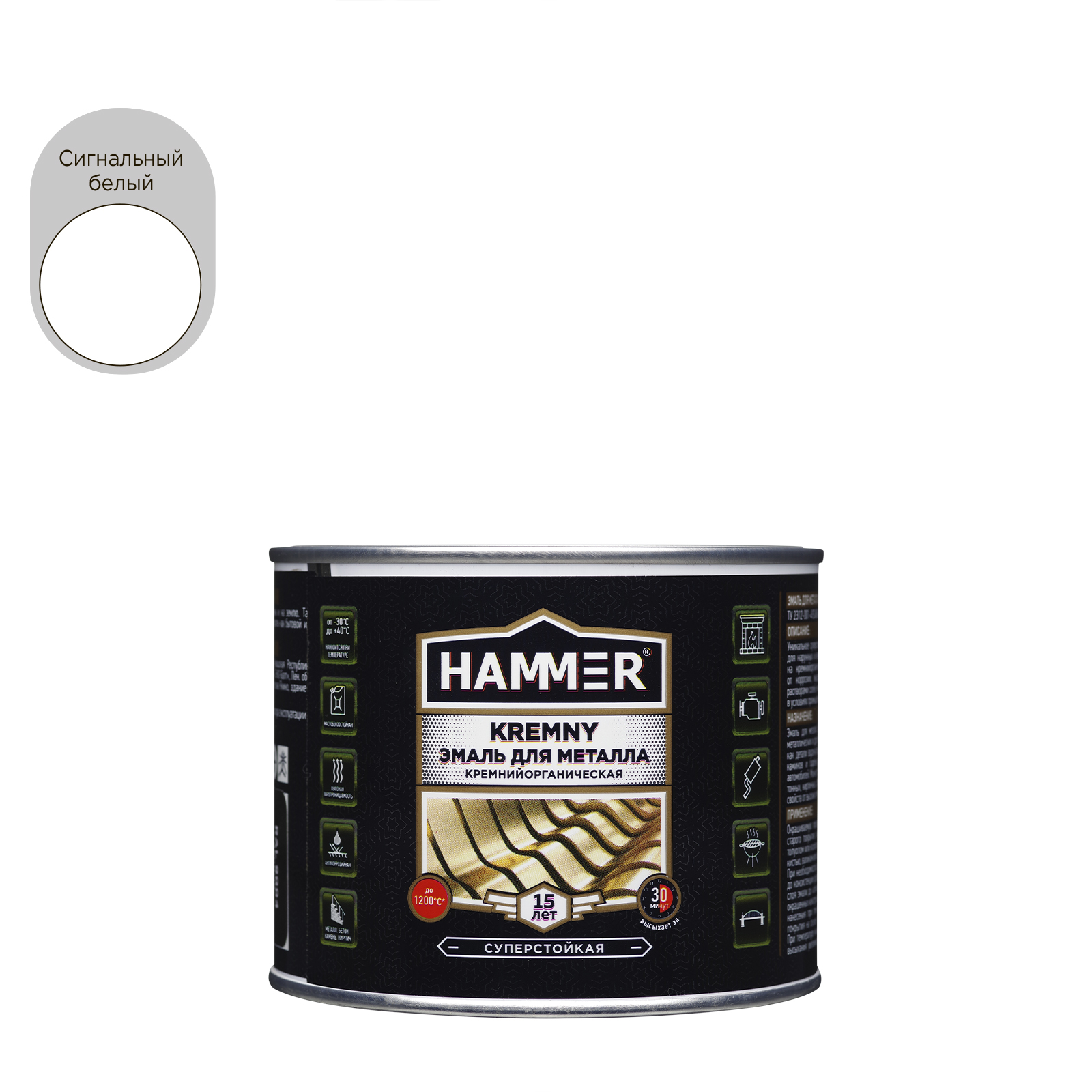Эмаль для металла HAMMER KREMNY предназначается для защиты и окраски металлических и других поверхностей, подверженных нагреванию до +1200С°, таких, как детали водонагревательного и котельного оборудования, печей для бань, саун, каминов и барбекю, радиаторов отопления и элементов выхлопной системы автомобилей. Может применяться для окраски изделий из камня, бетонных, железобетонных, кирпичных, асбестоцементных поверхностей с целью придания им защитных свойств от высоких температур, воды, атмосферных осадков, агрессивных сред.