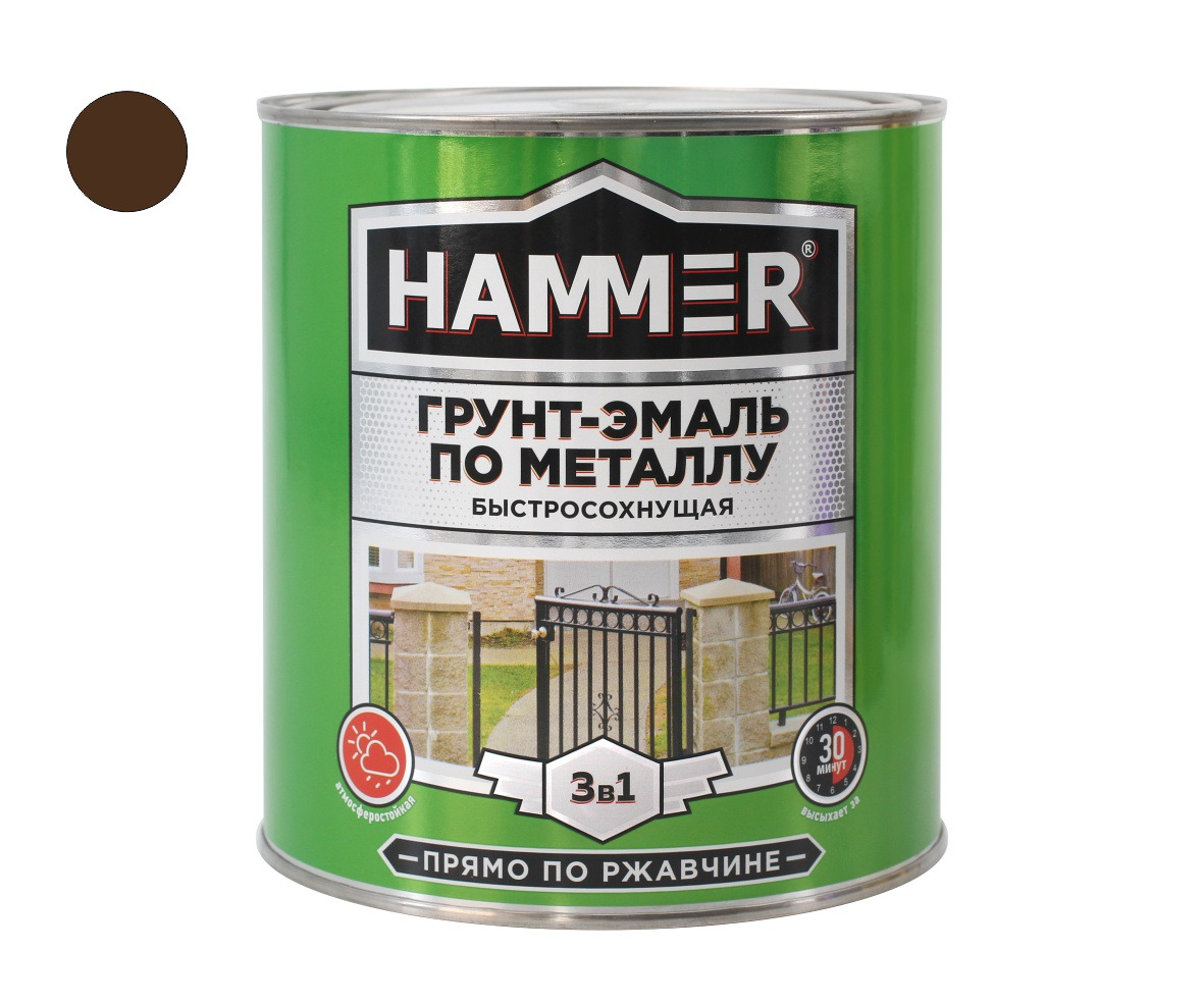 Грунт-эмаль по металлу HAMMER «3 в 1» быстросохнущая совмещает свойства преобразователя ржавчины, антикоррозийной грунтовки и эмали. Предназначена для наружных и внутренних работ по металлу и дереву.
