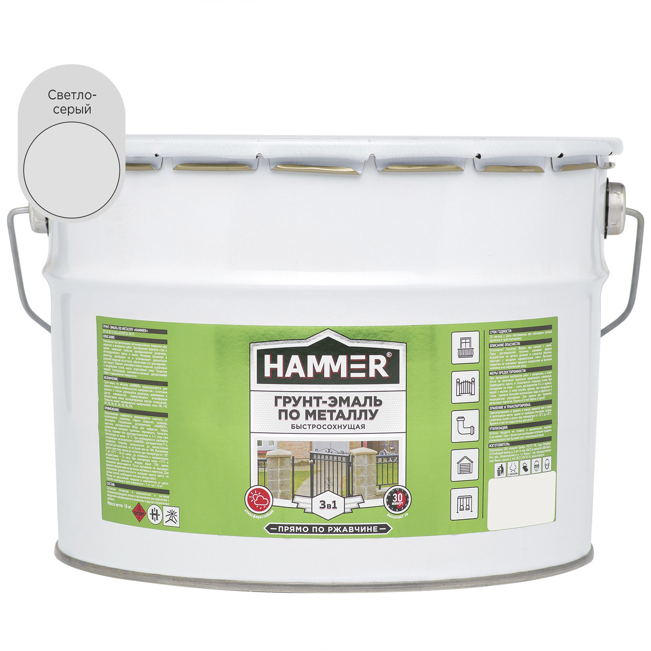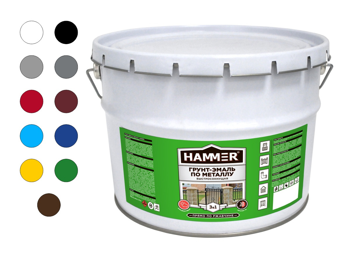 Грунт-эмаль по металлу HAMMER «3 в 1» быстросохнущая совмещает свойства преобразователя ржавчины, антикоррозийной грунтовки и эмали. Предназначена для наружных и внутренних работ по металлу и дереву.