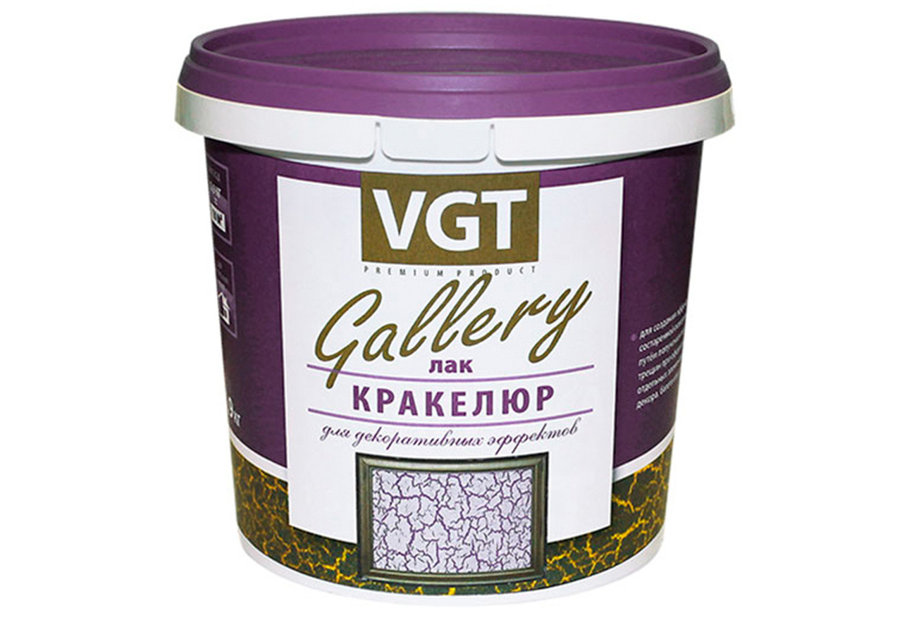Лак предназначен для создания декоративного эффекта состаренной поверхности путём получения паутины трещин при оформлении отдельных элементов декора, багета или стен. Применяется для внутренних работ при декоративной отделке по минеральным и деревянным поверхностям в качестве промежуточного слоя между двумя водно-дисперсионными акриловыми материалами. Лак представляет собой однородную вязкую жидкость белого цвета. После высыхания становится прозрачным. Готов к применению. Используется для внутренних работ в качестве промежуточного слоя между двумя водно-дисперсионными акриловыми красками VGT разного цвета, при этом, сам лак, оставаясь прозрачным, растрескивает финишную краску, проявляя в трещинах нижний слой