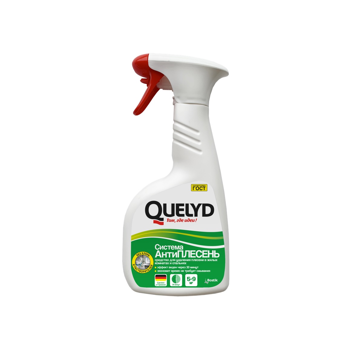Средство для удаления плесени Quelyd АнтиПЛЕСЕНЬ для комнат и спален хорошо удаляет внутри помещений грибок, пятна плесени со штукатурки, камня, плитки, швов, пластмассы, обоев и других материалов. Средство препятствует повторному появлению плесени, не содержит растворителей, хлора и на 95% биологически разлагается.