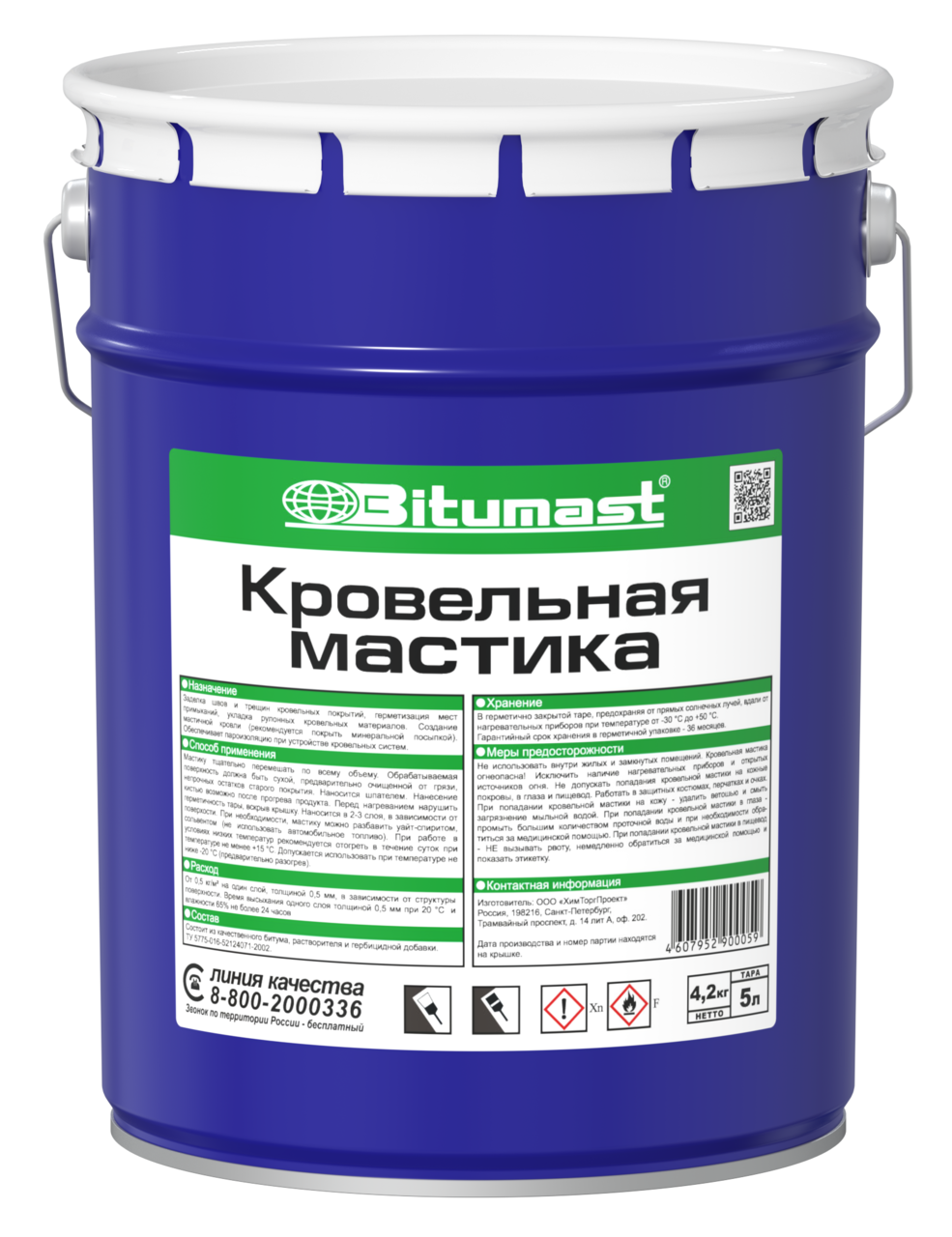 Кровельная мастика совместима с большинством битумных и битумно-полимерных материалов, обладает густой консистенцией, не растекается в горизонтальных швах и трещинах. Содержит гербицид, препятствующий росту растений, а также распространению мхов и лишайников в кровельном полотне.
