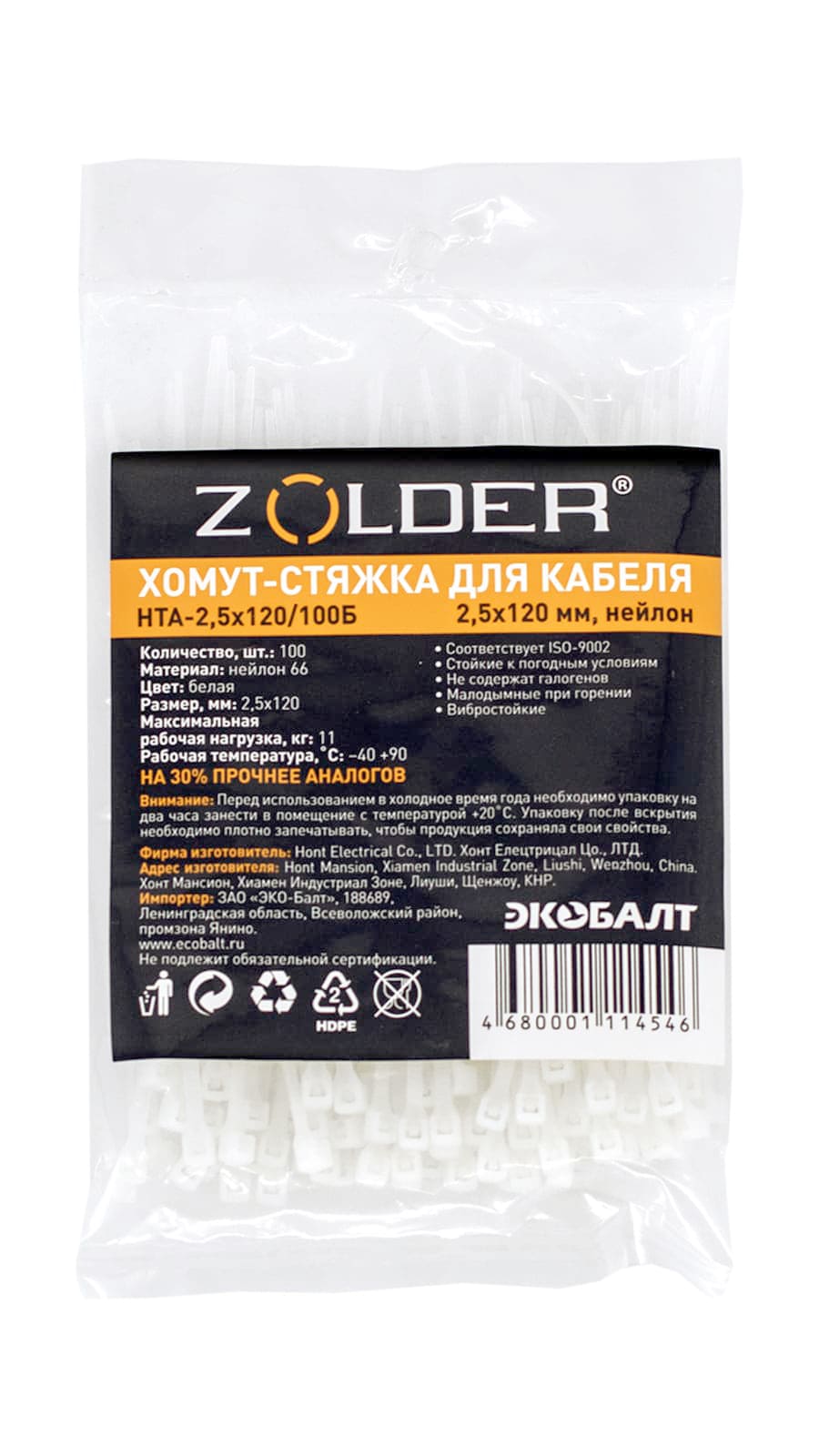 Хомуты-стяжки кабельные нейлоновые ZOLDER предназначены для увязки в пучок и монтажа кабелей и проводников. Это один из наиболее простых, удобных, быстрых и недорогих способов крепления и бандажирования кабелей при проведении электромонтажных работ. Также хомуты-стяжки широко используются в быту. Стяжки выполнены из морозостойкого нейлона, сохраняет высокую прочность и пластичность в широком диапазоне температур: от -40°С до + 90°С. Выдерживают рабочую нагрузку до 11 кг.