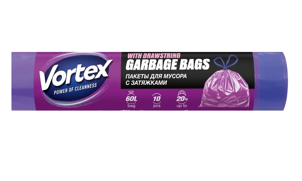 Пакеты для мусора ТМ Vortex – это современный гигиеничный вид упаковки бытовых отходов, используется не только дома, но и во время активного отдыха на природе, на даче. Пакеты для мусора ТМ Vortex крепко и надёжно фиксируются на краях ведра, предотвращая сползание пакета и загрязнение корзины. Мусорный пакет легко вынимается из корзины и закрывается за счёт наличия эластичных затяжек. Специально разработанная рецептура и высокотехнологичное производство с использованием импортного сырья обеспечивают повышенную прочность и эластичность пакетов ТМ Vortex, выдерживают 20 кг.