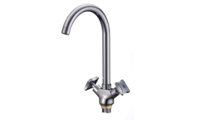 Смеситель вентильный, двуручный для кухни, с высоким поворотным изливом, механизм: латунная кран-букса, материал: сплав цинковый, покрытие: хром
