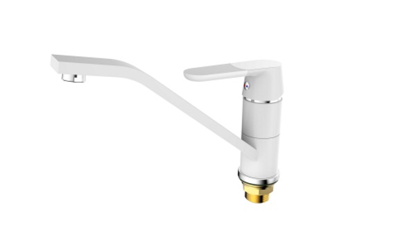 Смеситель одноручный, рычажный для кухонной раковины, с длинным поворотным изливом, запорная часть: картридж керамический, материал: сплав цинковый, покрытие в цвете белый/хром