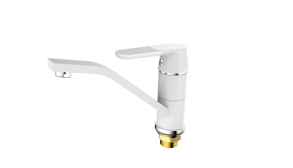 Смеситель одноручный, рычажный для кухонной раковины, с коротким поворотным изливом, запорная часть: картридж керамический, материал: сплав цинковый, покрытие в цвете белый/хром