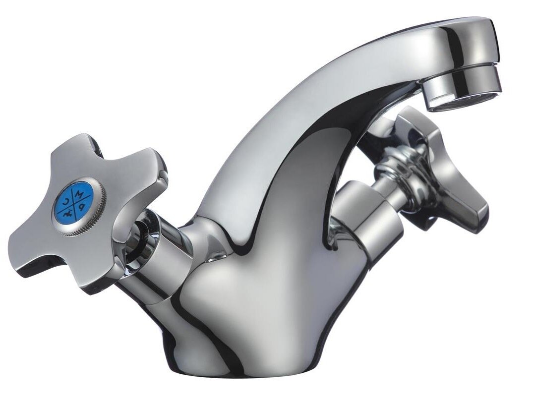 Смеситель двухвентильный литой для умывальника, механизм: кран-букса, материал: сплав цинковый, цвет: хром