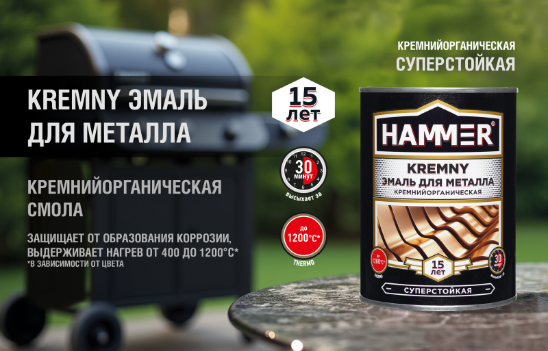 Готовите дачу к майским праздникам? Хотите обновить мангал или покрасить печь в бане? Вам подойдёт HAMMER KREMNY — термостойкая эмаль на кремнийорганической смоле, которая выдерживает температуру до 1200 °C и защищает металл даже в самых жёстких условиях.