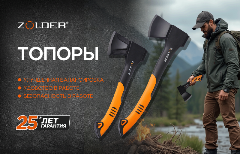 В продаже появились два новых топора от бренда Zolder — топор-колун и универсальный топор. Эти инструменты созданы для удобства и эффективности в любых условиях — на даче, в походе или дома.- Топор-колун Zolder — идеален для колки дров. Утолщенное клиновидное лезвие и массивная конструкция позволяют легко раскалывать даже плотные поленья. Прочная фиберглассовая рукоять с антивибрационным покрытием делает работу комфортной и безопасной.