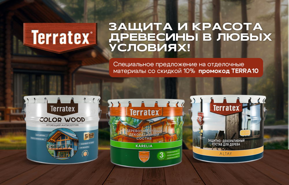 Применяйте промокод TERRA10 при покупке и получайте скидку на весь ассортимент защитно-декоративных составов для деревянных конструкций.